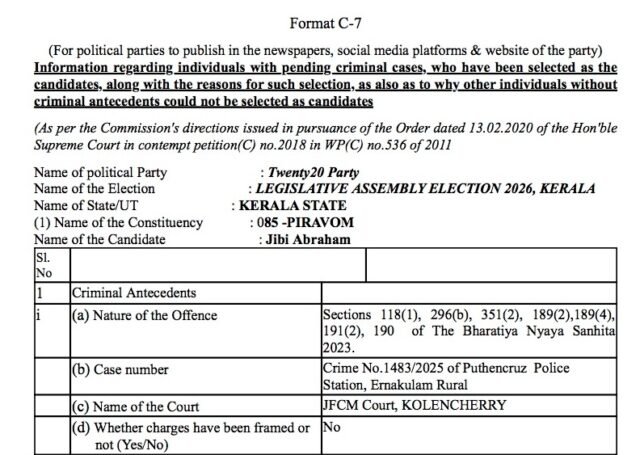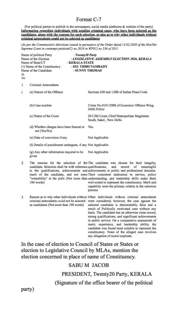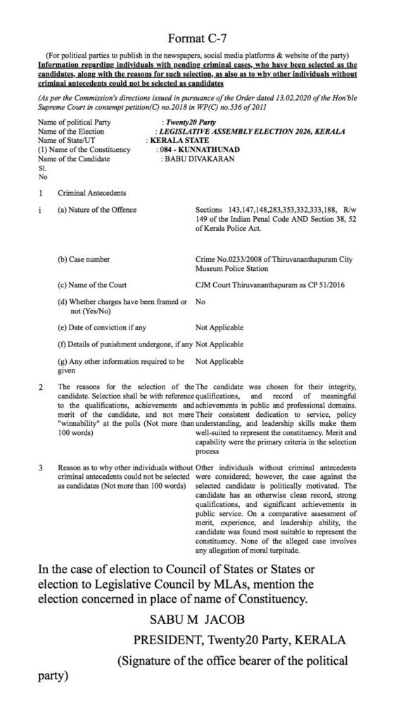 2026 നിയമസഭാ തിരഞ്ഞെടുപ്പുമായി ബന്ധപ്പെട്ട് തിരഞ്ഞെടുപ്പ് കമ്മീഷന്റെ മാനദണ്ഡപ്രകാരം പ്രസിദ്ധീകരിക്കുന്നത്.