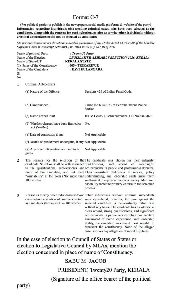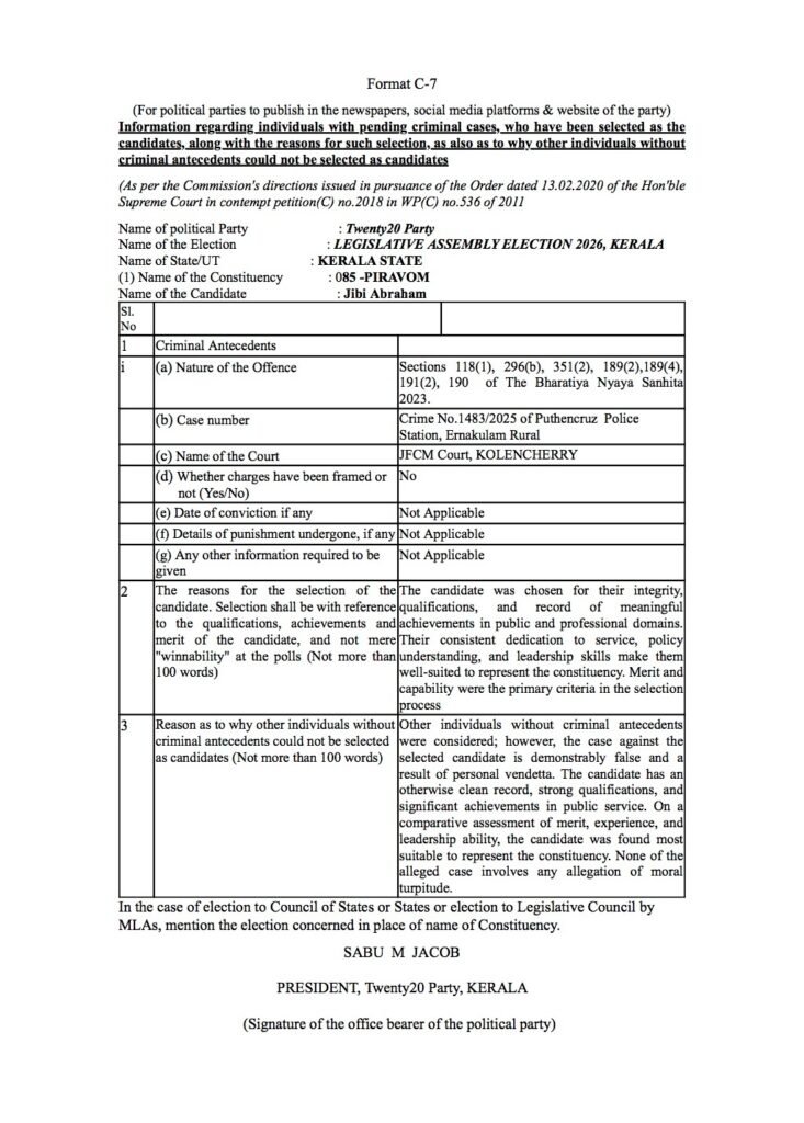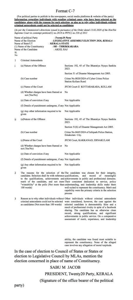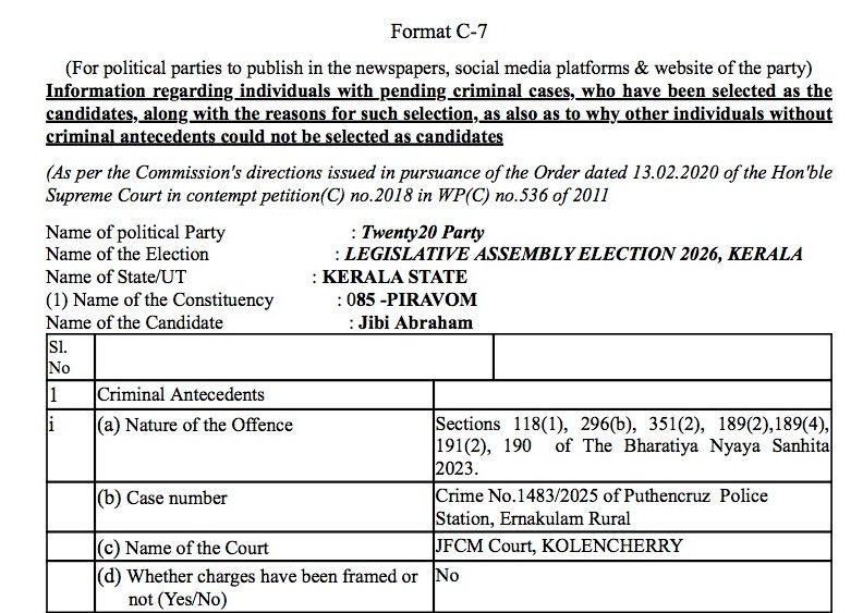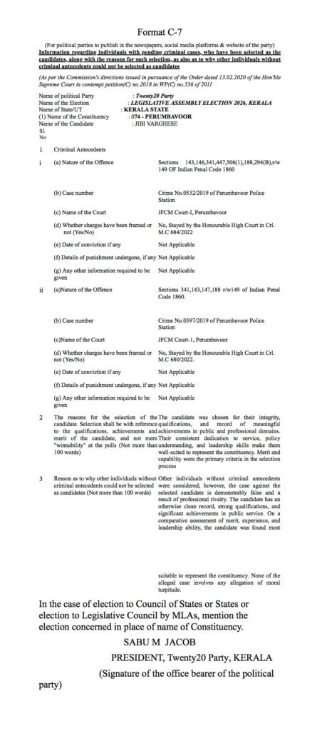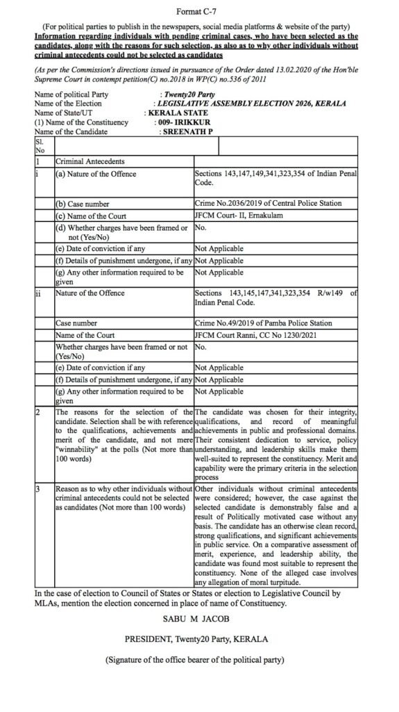 പിറവം മണ്ഡലത്തിൽ മത്സരിക്കുന്ന ജിബി അബ്രഹാം, തൃക്കാക്കര മണ്ഡലത്തിൽ മത്സരിക്കുന്ന അഖിൽ രാജ്, പെരുമ്പാവൂർ മണ്ഡലത്തിൽ മത്സരിക്കുന്ന ജിബി വർഗീസ്, കുന്നത്തുനാട് മണ്ഡലത്തിൽ മത്സരിക്കുന്ന ബാബു ദിവാകരൻ, തിരുവമ്പാടി മണ്ഡലത്തിൽ മത്സരിക്കുന്ന സണ്ണി തോമസ്, ഇരിക്കൂർ മണ്ഡലത്തിൽ മത്സരിക്കുന്ന ശ്രീനാഥ് പി, തൃക്കരിപ്പൂർ മണ്ഡലത്തിൽ മത്സരിക്കുന്ന രവി കുളങ്ങര എന്നീ ട്വന്റി 20 സ്ഥാനാർത്ഥികളുടെ പേരിൽ മുൻകാലങ്ങളിൽ രജിസ്റ്റർ ചെയ്യപ്പെട്ട കേസുകളുടെ വിവരങ്ങൾ താഴെ നൽകുന്നു.