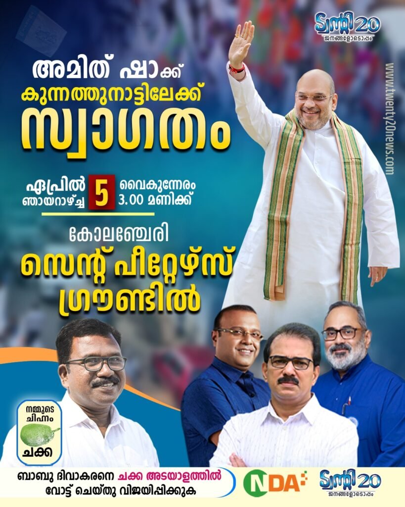 കുന്നത്തുനാട് നിയോജകമണ്ഡലം ട്വന്റി 20-എന്ഡിഎ സ്ഥാനാര്ഥി ബാബു ദിവാകരന്റെ തിരഞ്ഞെടുപ്പ് പ്രചരണത്തിനായി കേന്ദ്ര ആഭ്യന്തര മന്ത്രി അമിത് ഷാ എത്തുന്നു. ഏപ്രില് അഞ്ച് ഞായറാഴ്ച വൈകുന്നേരം മൂന്നു മണിക്ക് കോലഞ്ചേരി സെന്റ് പീറ്റേഴ്സ് ഗ്രൗണ്ടില് നടക്കുന്ന സമ്മേളനത്തില് ആയിരക്കണക്കിന് എന്ഡിഎ പ്രവര്ത്തകരെയും വോട്ടര്മാരെയും അമിത് ഷാ അഭിസംബോധന ചെയ്യും. വികസിത ഭാരതം എന്ന പ്രധാനമന്ത്രി നരേന്ദ്ര മോഡിയുടെ വികസന കാഴ്ചപ്പാടുകളില് കുന്നത്തുനാട്ടില് നിന്നും ഒരു നിയമസഭാ സാമാജികന് ഉണ്ടാവേണ്ടതിന്റെ ആവശ്യകതയും വികസിത കേരളത്തിനായി എന്ഡിഎ ലക്ഷ്യമിടുന്ന സ്വപ്ന പദ്ധതികളെ കുറിച്ചും അദ്ദേഹം സംസാരിക്കും.