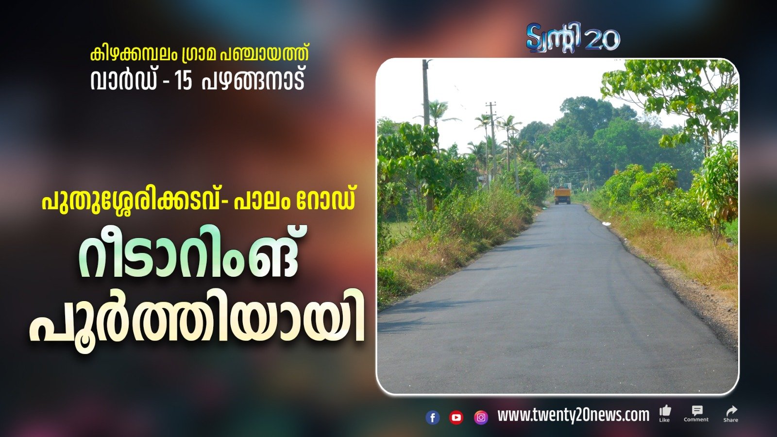 പഞ്ചായത്ത് തലത്തില് ട്വന്റി20യുടെ വികസ മുന്നേറ്റങ്ങളില് മറ്റൊരു നാഴികക്കല്ല് തീര്ത്ത് പുതുശ്ശേരിക്കടവ് പാലം റോഡ് റീ ടാറിംങ്ങ് പൂര്ത്തിയായി. കിഴക്കമ്പലം ഗ്രാമ പഞ്ചായത്തിലെ വാര്ഡ് 15 പഴങ്ങനാടിലെ കടമ്പ്രയാറിനോട് ചേര്ന്നുകിടക്കുന്ന റോഡാണ് പുതുശ്ശേരിക്കടവ് പാലം റോഡ്. 880 മീറ്റര് നീളമുള്ള ഈ റോഡിന്റെ റീ ടാറിങ്ങിന് 10 ലക്ഷം രൂപയാണ് വകയിരുത്തിയത്.