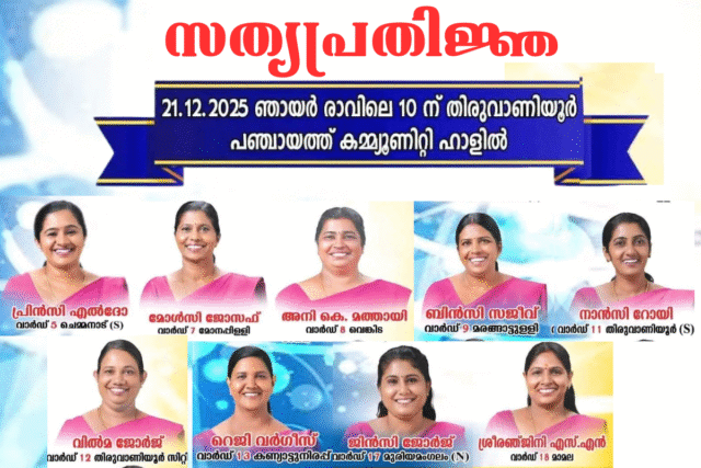 പരമ്പരാഗത രാഷ്ട്രീയ പാര്‍ട്ടികളുടെ കോട്ടകള്‍ തകര്‍ത്ത് മികച്ച വിജയം കരസ്ഥമാക്കിയ തിരുവാണിയൂര്‍ പഞ്ചായത്തിലെ ട്വന്റി20യുടെ പുതിയ സാരഥികള്‍ അധികാരമേല്‍ക്കുന്നു. 21-12-2025 ഞായറാഴ്ച രാവിലെ 10ന് തിരുവാണിയൂര്‍ പഞ്ചായത്ത് കമ്മ്യൂണിറ്റി ഹാളില്‍ നടക്കുന്ന ചടങ്ങില്‍ ട്വന്റി20യുടെ ജനപ്രതിനിധികള്‍ സത്യപ്രതിജ്ഞ ചെയ്ത് അധികാരമേല്‍ക്കും.